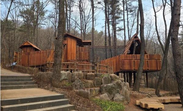 눈길을 끄는 것은 수락 휴의 인기 시설인 트리하우스에서 착안한 3동의 놀이시설이다. 너와지붕과 하늘이 보이는 천창을 도입해, 기존 트리하우스에서는 구현하기 어려웠던 ‘나무와 하나가 된 집’ 형태를 완성했다. 여러 그루의 잣나무와 굴참나무가 놀이시설을 관통하며 숲과 시설이 경계없이 어우러지는 특별한 공간감을 선사한다. 다락과 계단, 박공지붕 구조는 동화책 속 집을 연상시켜 어른들에게는 향수를, 아이들에게는 새로운 흥미를 선사할 예정이다. 각 동을 연결하는 공중 네트는 아이들의 모험심을 자극하도록 설계됐다.