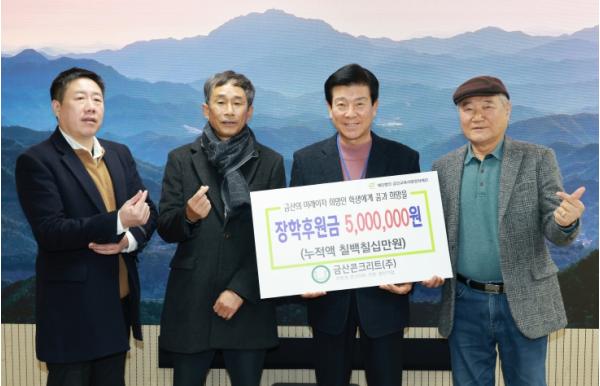 박범인 군수는 “어려운 여건 속에서도 꾸준히 나눔을 실천해 온 금산콘크리트에 깊이 감사드린다”며 “장학기금은 지역 인재 육성을 위해 소중히 활용하겠다”고 전했다.
