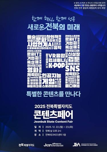 (재)전북특별자치도 콘텐츠융합진흥원과 전북특별자치도 콘텐츠산업협회는 ‘2025 전북특별자치도 콘텐츠페어’를 오는 12월 22일 오후 2시, 전북테크비즈센터에서 공동 주관으로 개최한다고 밝혔다.