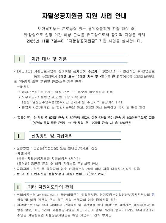[한국제일신문, 김성광기자] 원주시는 오는 26일까지 2025년 ‘자활성공지원금’ 신청을 접수한다.