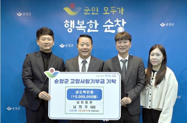 [한국제일신문, 이미란기자] 순창군은 18일 정읍 소재 남미회관 남희우 대표가 순창군에 고향사랑기부금 500만원을 기탁했다고 밝혔다.