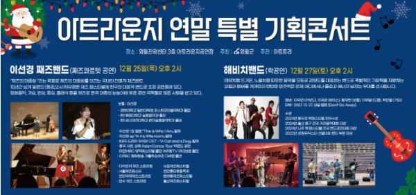 크리스마스인 25일에는 재즈의 대중화를 이끄는 국내의 대표적 재즈밴드 “이선경 재즈밴드”의 재즈콰르텟 공연이, 27일에는 감성과 에너지를 겸비한 인디록 밴드 “해비치밴드”의 록 공연이 개최된다.