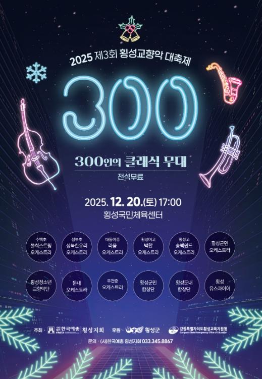 올해로 세 번째를 맞는 이번 대축제는 초등학생부터 청소년, 성인까지 세대를 아우르는 300명이 넘는 연주자와 합창단원이 함께 만드는 대규모 클래식 공연으로, 지역 예술교육의 성과와 공동체 문화의 힘을 한자리에서 보여주는 횡성의 대표적인 음악 축제다.