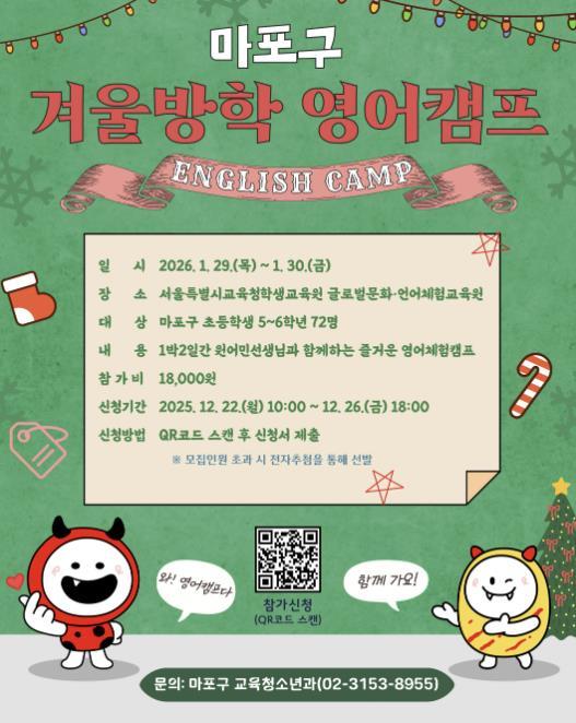 모든 프로그램은 서울특별시교육청 학생교육원 소속 원어민 교사가 운영하며, 마포구는 교육원과 협력해 생활실 관리와 안전교육, 응급상황 대응체계를 체계적으로 마련해 캠프 전반의 안전 관리를 강화할 예정이다.