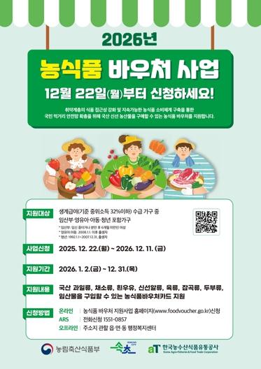 [한국제일신문, 김성옥기자] 속초시가 2025년 12월 22일부터 2026년 농식품 바우처 지원사업 신청접수를 시작한다.