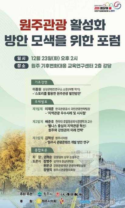 [한국제일신문, 김성광기자] 원주시는 오는 23일 오후 2시, 기후변화대응교육연구센터 2층 대강당에서 ‘원주관광 활성화 방안 모색을 위한 포럼’을 개최한다.