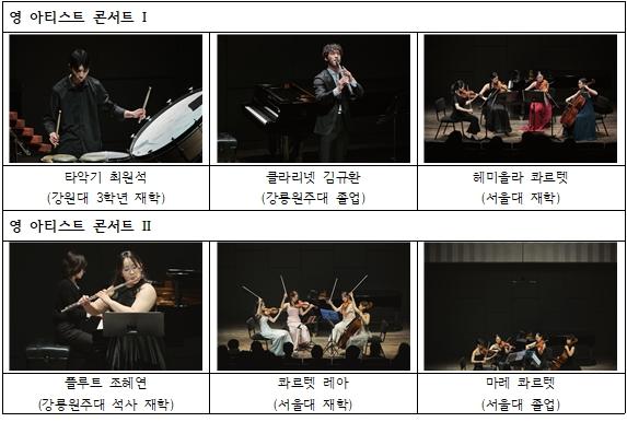 ‘영 아티스트 콘서트’는 강원도 내 음악대학 출신의 우수 인재와 대관령아카데미 시즌 교육프로그램인 ‘실내악 멘토십 프로그램’에 참여한 실력 있는 실내악 팀들이 무대에 올랐다.