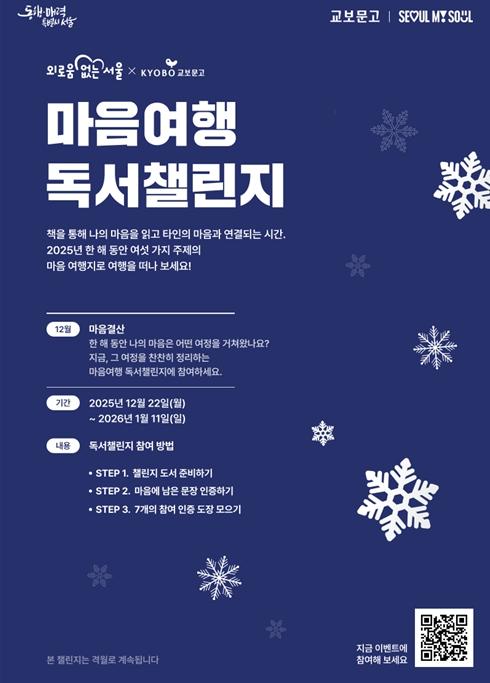 [한국제일신문, 김성옥기자] 서울시가 ‘외로움 없는 서울’을 만들기 위한 노력의 일환으로 교보문고와 함께 여섯 번째 ‘마음여행 독서챌린지’를 진행한다. 이번 챌린지는 ‘마음결산’을 주제로, 올해 나의 마음을 움직인 책과 그 속에서 기억에 남는 문장을 선택해 ‘2025 마음결산 리포트’를 완성하며 한 해의 여정을 마무리한다.