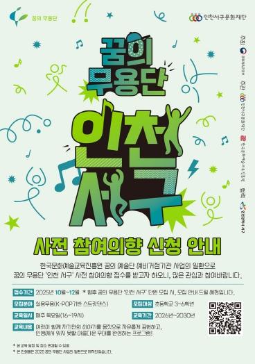 한편, 인천서구문화재단은 향후 ‘꿈의 무용단 인천 서구’ 사업 참여를 희망하는 예비 단원의 수요 파악을 위해 오는 12월 31일까지 사전 참여의향 접수를 진행한다. 참여 방법 등 자세한 사항은 인천서구문화재단 홈페이지에서 확인할 수 있다.