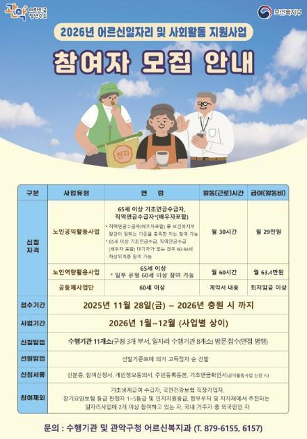 [한국제일신문, 김성옥기자] 관악구가 초고령시대 진입을 앞두고 어르신들의 사회참여 증진과 노후 소득 보장을 위해 ‘2026년 노인일자리 및 사회활동 지원사업’을 대폭 확대 추진한다.