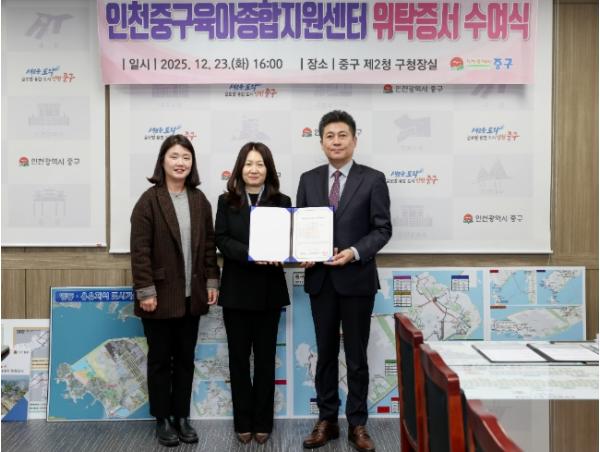 인천시 중구는 지난 23일 오후 제2청 구청장실에서 한빛바른보육경영원과 ‘인천중구육아종합지원센터 위탁운영 계약’을 체결했다.