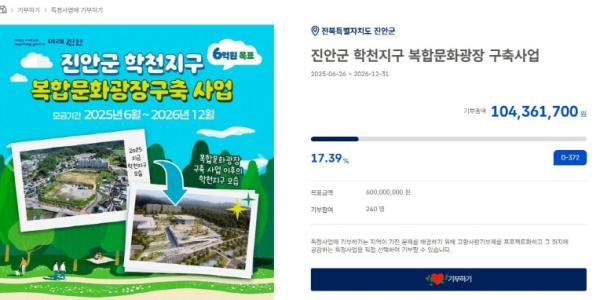[한국제일신문, 김성관기자] 진안군이 고향사랑기부제 지정기부사업으로 지난 6월부터 추진 중인 “학천지구 복합문화광장 구축사업”이 모금 시작 6개월 만에 누적 모금액 1억 원을 달성했다.