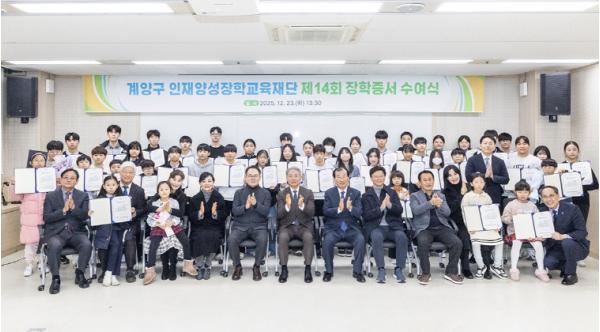 올해 하반기에 14회째 장학생을 선발한 계양구 인재양성장학교육재단은 2019년부터 총 921명에게 약 10억 6,200만 원의 장학금을 지원했으며, 2026년 상반기 장학생 모집은 내년 3월에 공고할 계획이다.