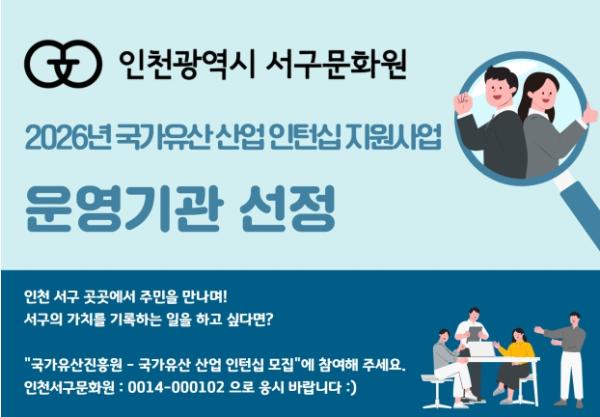 [한국제일신문, 김성옥기자] 인천광역시 서구문화원(원장 정군섭)은 국가유산청이 주최하는 ‘2026년 국가유산 산업 인턴십 지원사업’에 선정됐다고 밝혔다.