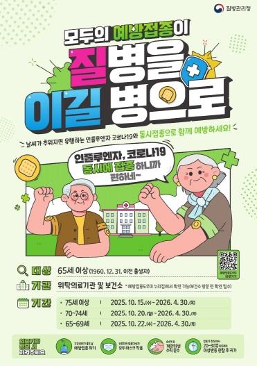 이번 절기 인플루엔자 예방접종은 65세 이상 어르신, 임산부, 어린이를 대상으로 실시되며, 코로나19 예방접종은 65세 이상 어르신, 면역저하자 및 감염취약시설 입소자를 대상으로 실시하고 있다.