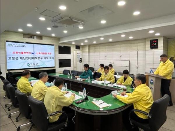 [한국제일신문, 이미란기자] 고창군이 24일 김영식 부군수주재로 군청 재난안전상황실에서 행정안전부와 함께 재난안전대책본부 회의를 열고, 고병원성 조류인플루엔자(AI) 확산 방지를 위한 방역관리 상황을 점검했다.