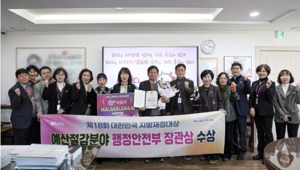 [한국제일신문, 김성옥기자] 마포구는 12월 17일, 행정안전부가 주관한 ‘제18회 대한민국 지방재정대상’에서 예산절감 분야 행정안전부 장관상을 수상하고 인센티브로 특별교부세 1억 원을 확보했다.