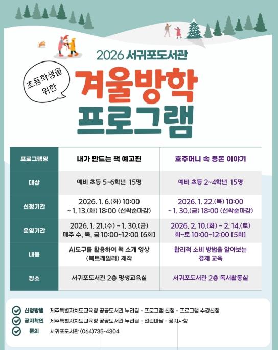 [한국제일신문, 김성옥기자] 제주도교육청 서귀포도서관은 겨울방학을 맞아 어린이들의 호기심을 자극해 책 읽기의 즐거움과 경제 감각을 키우는 겨울방학 프로그램을 운영하며, 내년 1월 6일부터 참가자를 모집한다.