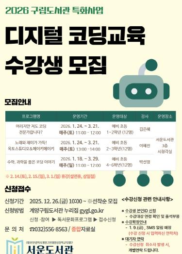 [한국제일신문, 김성옥기자] 인천 계양구 서운도서관(관장 권문혁)은 초등학생을 대상으로 오는 2026년 1월부터 3월까지 ‘디지털 코딩 교육’을 운영한다고 밝혔다.