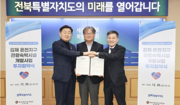 [한국제일신문, 윤진성기자] 전북특별자치도가 26일 도청 회의실에서 김제시, 베스트웨스턴플러스 김제호텔과 김제 온천지구 관광숙박시설 개발사업 투자협약(MOU)을 체결했다.