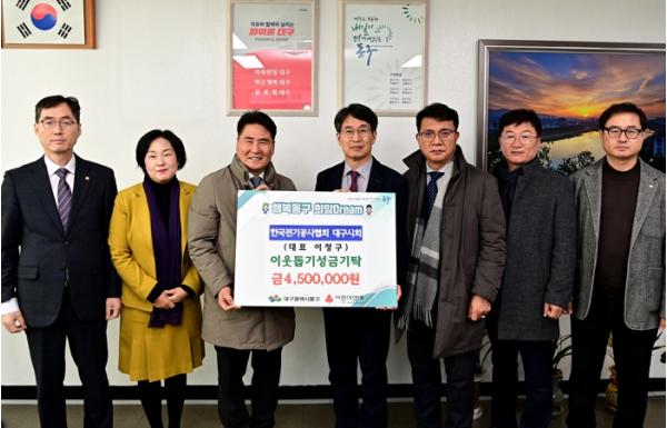윤석준 동구청장은 “매년 변함없이 이웃사랑을 실천해 주시는 한국전기공사협회 대구시회에 깊이 감사드린다”며 “기탁된 성금은 소외된 이웃들에게 소중히 전달하겠다”고 말했다.