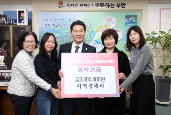 [한국제일신문, 김성관기자] 부안군근농인재육성재단은 지난 24일 부안군 지역경제과(과장 김연희)가 공공폐수처리시설 운영관리 실태평가에서 우수기관으로 선정돼 받은 포상금 중 일부인 300만원을 지역인재육성장학금으로 기탁했다고 밝혔다.