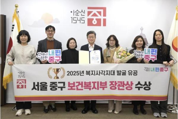 [한국제일신문, 김성옥기자] 서울 중구가 보건복지부 주관 ‘2025년 사회보장정보시스템 구축 및 운영평가’에서 ‘복지사각지대 발굴 분야’ 우수기관으로 선정돼 보건복지부 장관상을 수상했다.