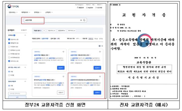 신청자는 정부24 누리집에서 직접 무시험검정 교원자격증을 신청할 수 있으며, 발급된 전자 자격증은 프린터로 출력하거나 PDF 파일로 저장할 수 있다.