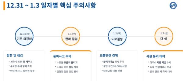 도로교통 분야에서는 도로 제설재를 기준 대비 105% 비축했으며, 3,377대의 제설 장비와 마을제설반 2,643대를 전진 배치했다. 특히 해맞이 명소 주변의 주요 간선도로와 사고 위험 지역에는 제설 살포 주기를 단축해 사고를 선제적으로 예방한다. 또한 교통정체와 차량 고립 방지를 위해 행사 당일에는 대중교통 이용을 적극 권장하고 있다.