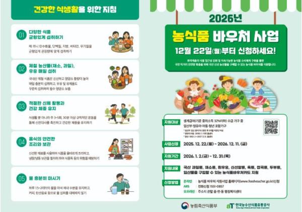 신규 신청은 주민등록 주소지 관할 읍·면·동 주민센터에 방문하거나 농식품바우처 홈페이지, ARS 등을 통해 신청이 가능하다.