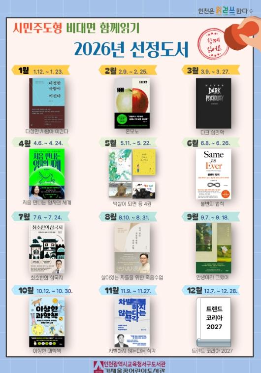 [한국제일신문, 김성옥기자] 인천광역시교육청서구도서관은 12월 31일 ‘2026년 시민주도형 비대면 함께읽기’ 도서 15권을 선정·발표했다.