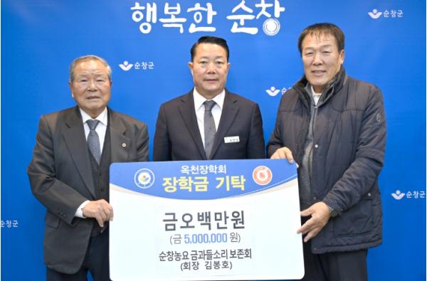 [한국제일신문, 이미란기자] 순창군은 최근 순창농요 금과들소리 보존회(회장 김봉호)가 (재)순창군옥천장학회에 장학금 500만원을 기탁하며 지역 인재 육성에 힘을 보탰다고 밝혔다.