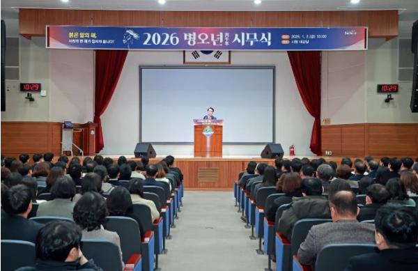 [한국제일신문, 김성옥기자] 사천시는 2일 오전 10시 시청 대강당에서 박동식 사천시장을 비롯해 김제홍 부시장, 국·소장 및 전 직원이 참석한 가운데 2026년 병오년 시무식을 개최했다.