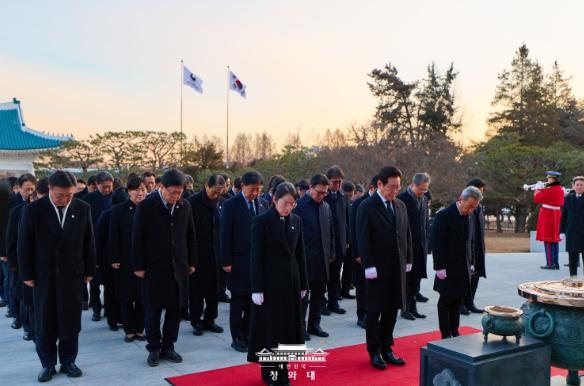 먼저 이 대통령은 현충탑에 헌화·분향한 뒤 묵념하며 순국선열과 호국영령의 넋을 기렸다. 이어 방명록에 '“함께 사는 세상” 대한민국 대도약의 원년 대한국민과 함께 열겠습니다'라고 서명하면서 병오년 새해 의지를 담았다.
