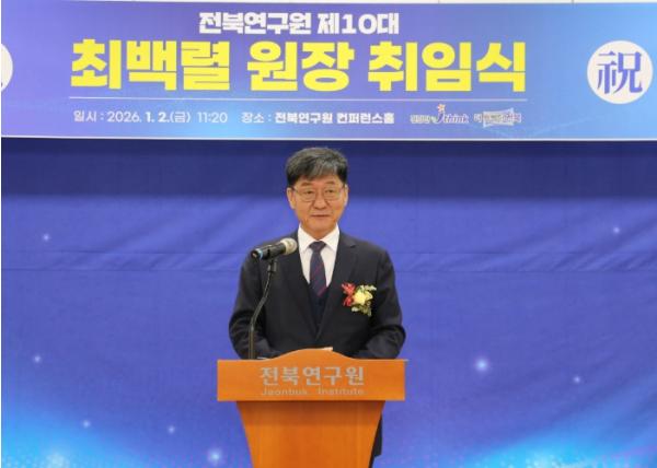 [한국제일신문, 윤진성기자] 전북연구원 제10대 최백렬 원장은 1월 2일 전북연구원에서 취임식을 갖고 본격적인 업무를 시작했다. 임기는 2026년 1월 1일부터 2028년 12월 31일까지부터 3년이다.