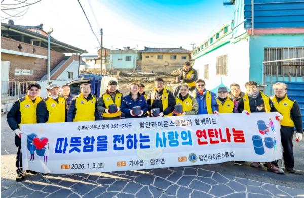 [한국제일신문, 김성옥기자] 함안군은 지난 3일 함안라이온스클럽(회장 이성재)이 겨울철 난방에 어려움을 겪는 이웃들을 돕기 위해 연탄 600장을 마련해 나눔을 실천했다고 밝혔다.