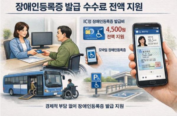 이번 지원은 모바일 장애인등록증 제도 시행에 맞춰 IC형 장애인등록증 발급 수수료 4,500원을 전액 시비로 지원하는 것이 골자다.