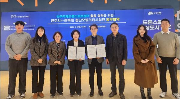 시와 전북대 첨단모빌리티 사업단(사업단장 이덕진 교수)은 6일 전주국제드론스포츠센터에서 임숙희 경제산업국장과 이덕진 단장 등 양 기관 관계자들이 참석한 가운데 전주국제드론스포츠센터를 활용한 드론 분야 상호 협력을 강화하는 내용의 업무협약을 체결했다.