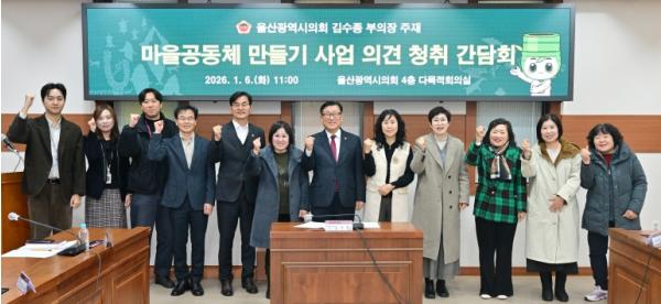 [한국제일신문, 김성옥기자] 울산광역시의회 김수종 부의장(방어·화정·대송동)은 6일 오전, 시의회 4층 다목적회의실에서 마을공동체 만들기 사업과 관련한 의견 청취 간담회를 개최했다.