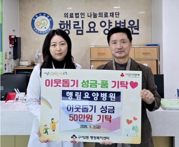 [한국제일신문, 김성옥기자] 의료법인 나눔의료재단 행림요양병원은 이웃돕기 성금 50만원을 구서2동 행정복지센터에 기탁했다.