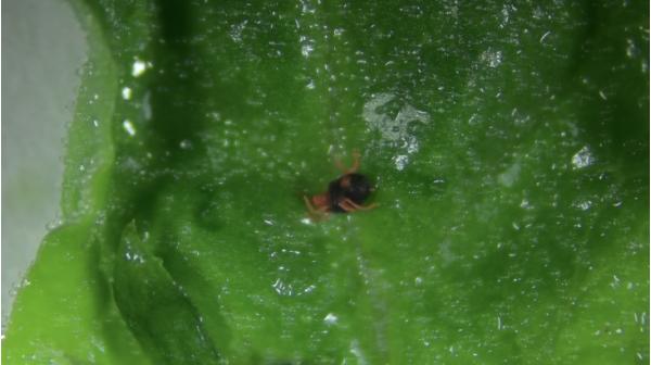 보리응애는 검은 몸체에 붉은색을 띤 네 쌍의 다리를 가졌다.