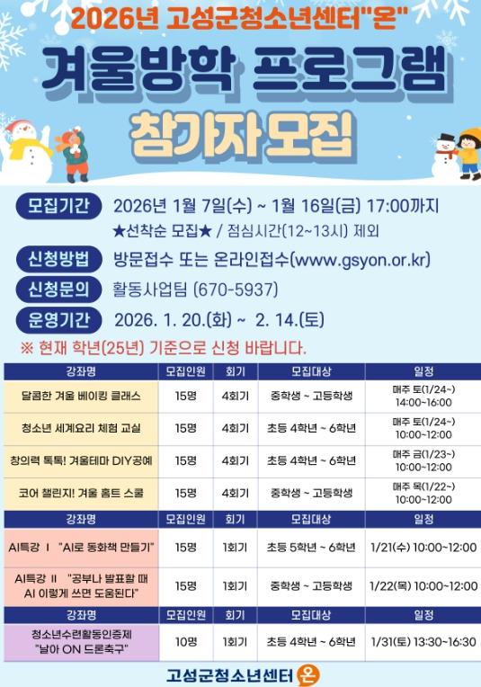 [한국제일신문, 김우성기자] 고성군청소년센터“온”은 겨울방학을 맞이한 관내 청소년들을 대상으로 2026년 1월 20일부터 2월 14일까지 2026년 겨울방학 프로그램 및 특강을 운영한다.