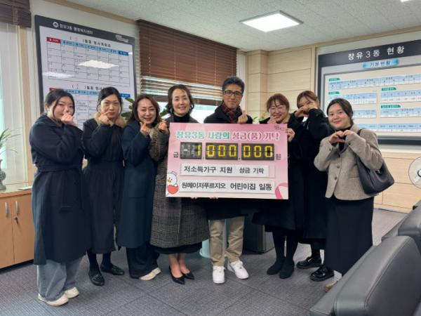 [한국제일신문, 김성옥기자] 국공립 원메이저푸르지오 어린이집(대표 김회희)에서 지난 7일 장유3동 내 어려운 이웃에게 전달해 달라며 현금100만원을 기탁했다.