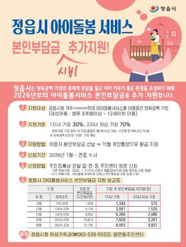 이번 사업의 핵심은 정부 지원을 받고도 부모가 추가로 지불해야 했던 비용을 정읍시가 대신 부담해 양육 가정의 실질적인 가계 지출을 줄여주는 데 있다.