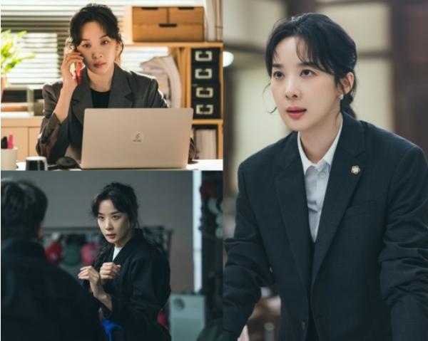 노트북 앞에 앉아 진지한 표정으로 전화를 받고 있는 장면에선 수사 중 포착된 미세한 단서도 놓치지 않겠다는 예리한 집중력과 프로페셔널한 면모가 전해진다. 날카로운 시선과 다부진 자세로 유도를 수련하는 이미지에선 유단자 변호사의 열혈 카리스마를 각인시킨다.