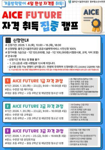 이번 캠프는 오는 1월 20일부터 23일까지 4일간 중부청소년수련관에서 진행되며, 청소년들이 인공지능 활용 능력을 인증하는 국가 공인급 자격인 ‘AICE FUTURE’ 1·2·3급을 집중적으로 대비하고 취득할 수 있도록 구성됐다.