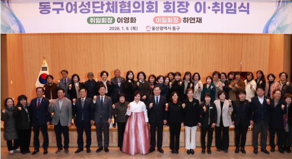 [한국제일신문, 김성옥기자] 동구여성단체협의회는 1월 8일 오후 2시 동구청 중강당에서 제26대 회장 이취임식을 개최하고, 신임 회장으로 이영화 회장이 공식 취임했다.