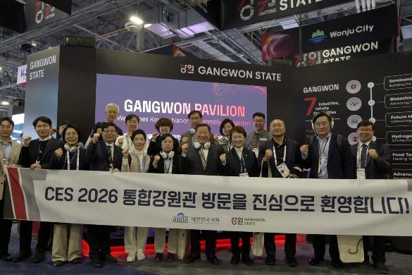 [한국제일신문, 김성옥기자] 세계 최대 IT·가전 전시회인 ‘CES 2026’이 열리고 있는 미국 라스베이거스에서 국회 방문단이 통합강원관을 찾아, 강원 기업들의 혁신 기술이 국회 관계자들의 주목을 받았다.