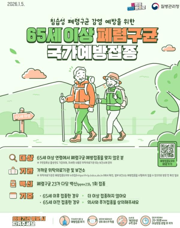 접종 대상은 폐렴구균 23가 다당 백신(PPSV23)을 접종하지 않은 1961년 12월 31일 이전 출생자는 가까운 보건(지)소, 보건진료소 및 위탁의료기관을 방문하면 무료접종(1회)을 받을 수 있다.