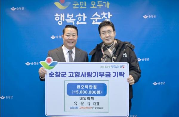 [한국제일신문, 이미란기자] 순창군은 9일 대일화학 유운규 대표가 고향사랑기부금 500만원을 기탁했다고 밝혔다.